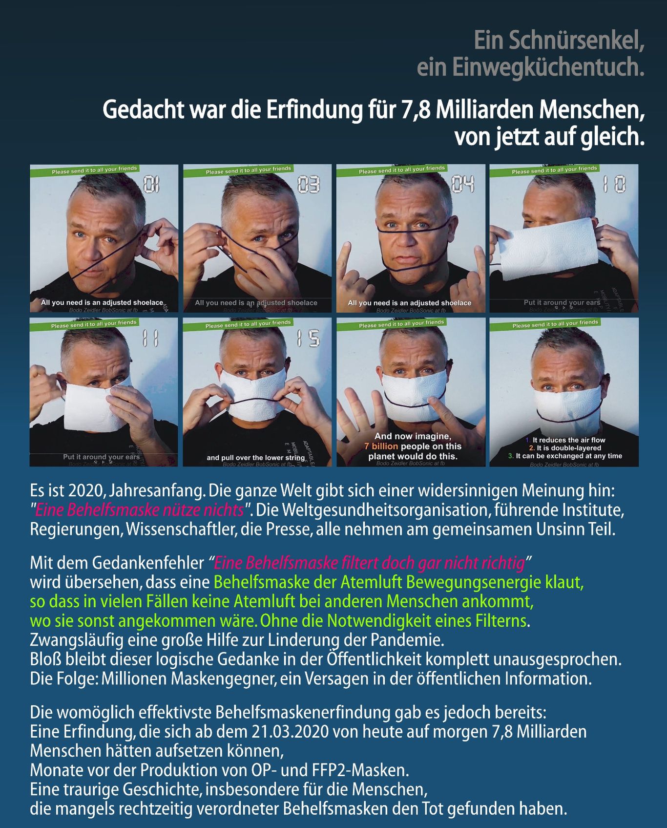 Meine Behelfsmaskenkonstruktion vom 21.03.2020, während WHO und Institute erst am 02.04.2020 einlenkten, mit 4 Monate verspäteter Behelfsmaskenverordnung am 27.04.2020 (weltweit 263.012 Sterbefälle bis zu diesem Datum)
