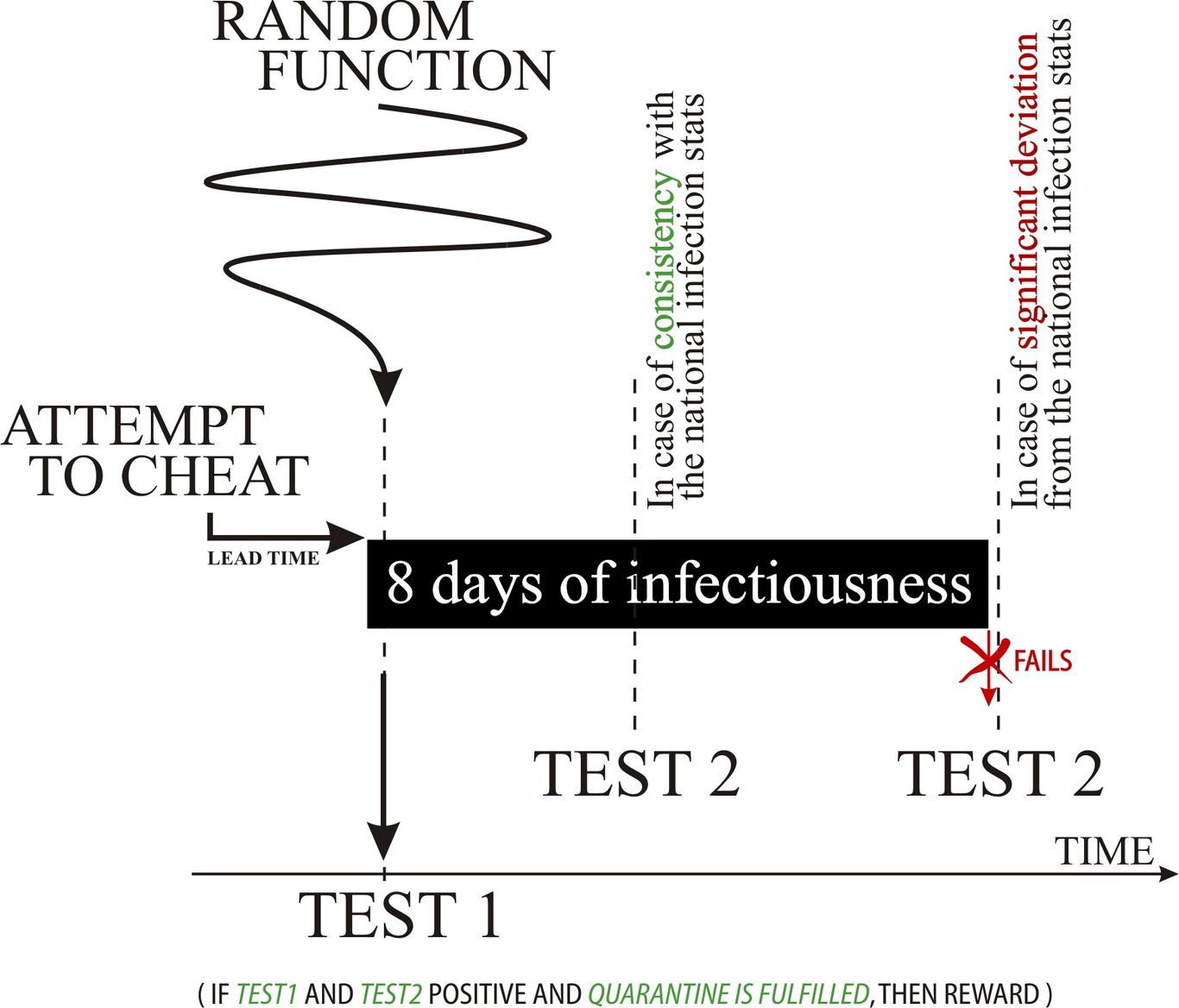 - L'objectif est de déclencher des événements de test pour environ 15 000 infections par jour. La fenêtre temporelle ALÉATOIRE pour le premier test est de 10 jours. Il est donc peu judicieux pour la mafia de la fraude déjà en place de deviner quand une infection délibérée par l'agent pathogène pourrait être profitable, car un deuxième test doit également être positif.